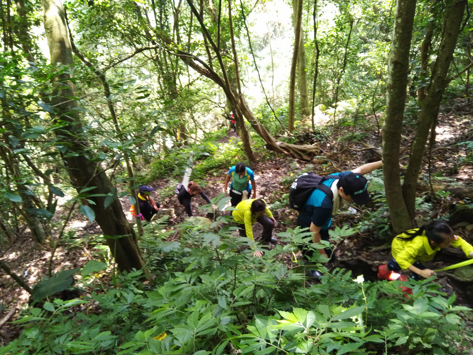 想不到還有小朋友也上山了,讚讚讚!! 在這一來一往當下才知道他們是來自彰化的登山團體,老中青三代都有,有些比較慢的人就會問說還有多久?! 此時我也老實回答要XX分鐘,而他們之中有些提早折返的人也說不用上去了,不好走喔~
